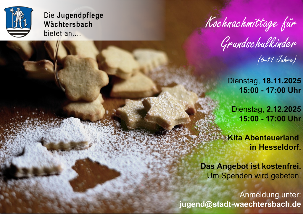 Die Jugendpflege der Stadt Wächtersbach bietet am 18. November und am 2. Dezember, jeweils von 15:00 bis 17:00 Uhr, gemütliche Kochnachmittage für Kinder im Grundschulalter (6 bis 11 Jahre) in den Räumlichkeiten der Kita Abenteuerland in Hesseldorf an.